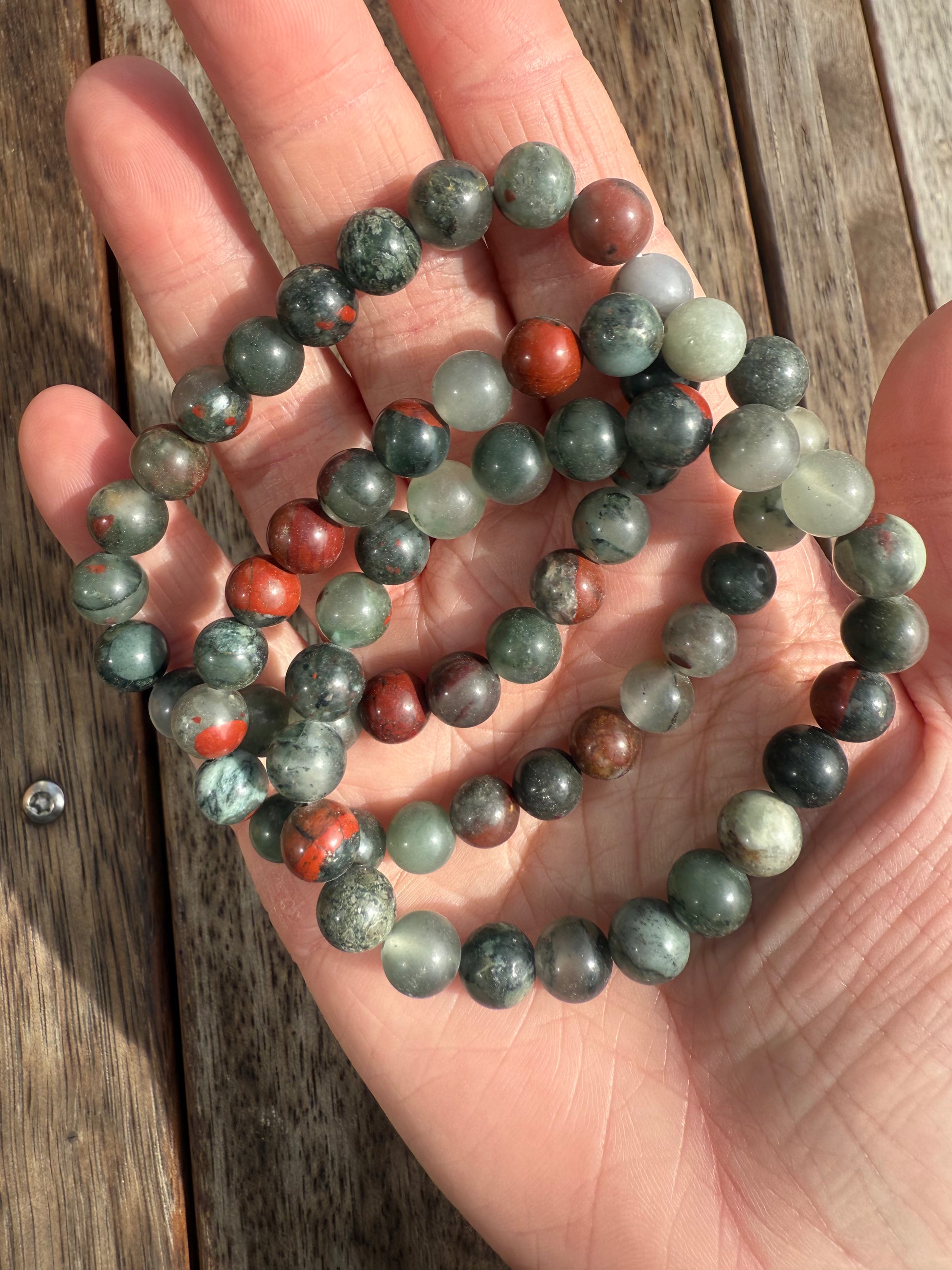 African Bloodstone, also known as heliotrope, is often regarded as a stone of strength, vitality, and protection, believed to ground energy and enhance physical endurance. It is thought to purify and revitalize the body and mind, supporting resilience and courage during challenges while easing stress and irritability. Many value it for its connection to the heart and root chakras, seeing it as a crystal that balances emotions, encourages perseverance, and promotes inner stability. In metaphysical practices, it is also associated with abundance, renewal, and the nurturing energy of the earth, making it a powerful ally for both healing and transformation.