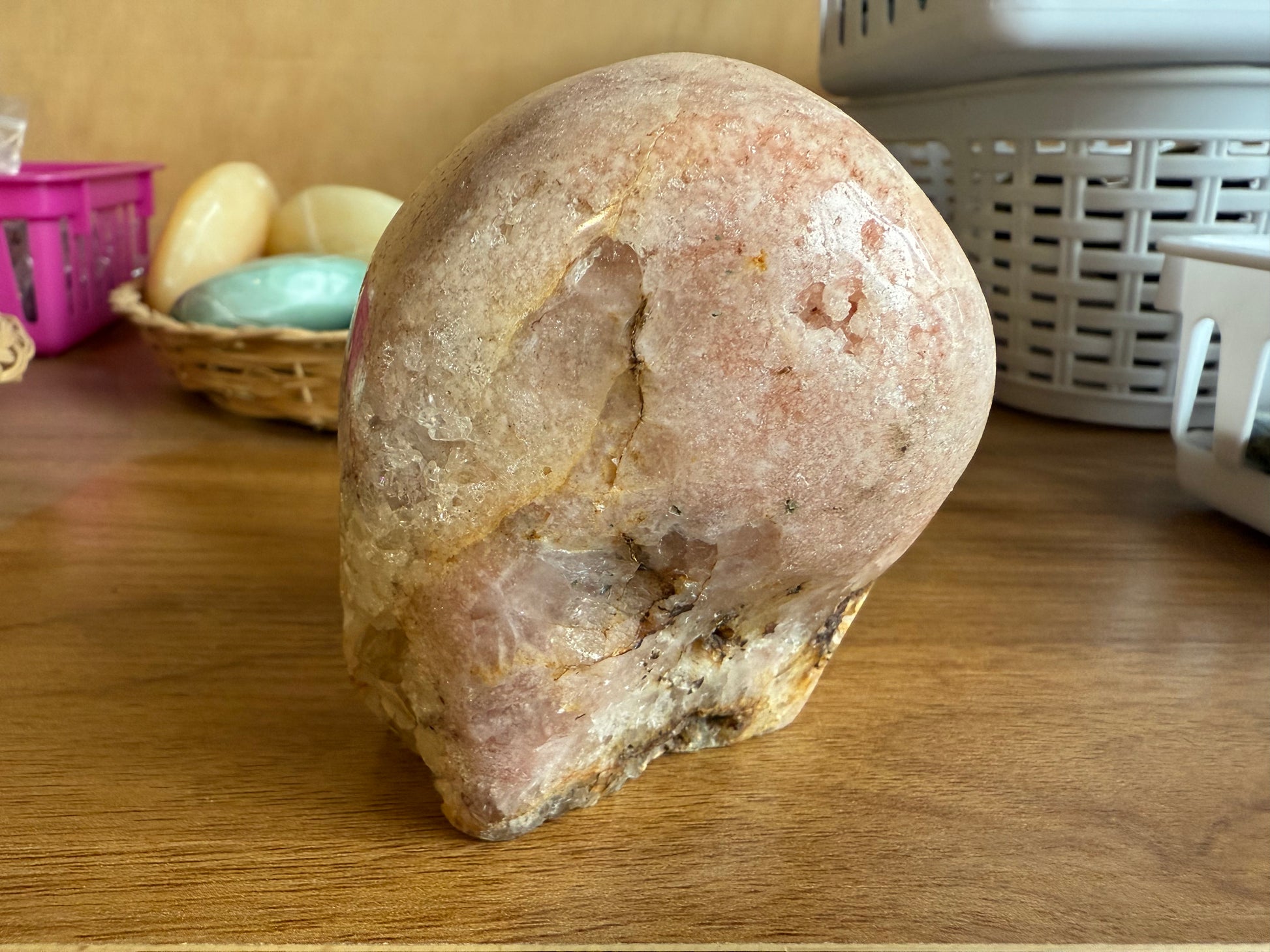 Pink amethyst offers metaphysical benefits such as promoting love, emotional healing, self-esteem, and spiritual connection by balancing the heart, third eye and crown chakras. It's said to alleviate stress, anxiety, and negative emotions, foster clarity and intuition, and create harmonious energy in living and work spaces. The crystal also supports transitions, assists with grief, and promotes restful sleep, according to some beliefs.
