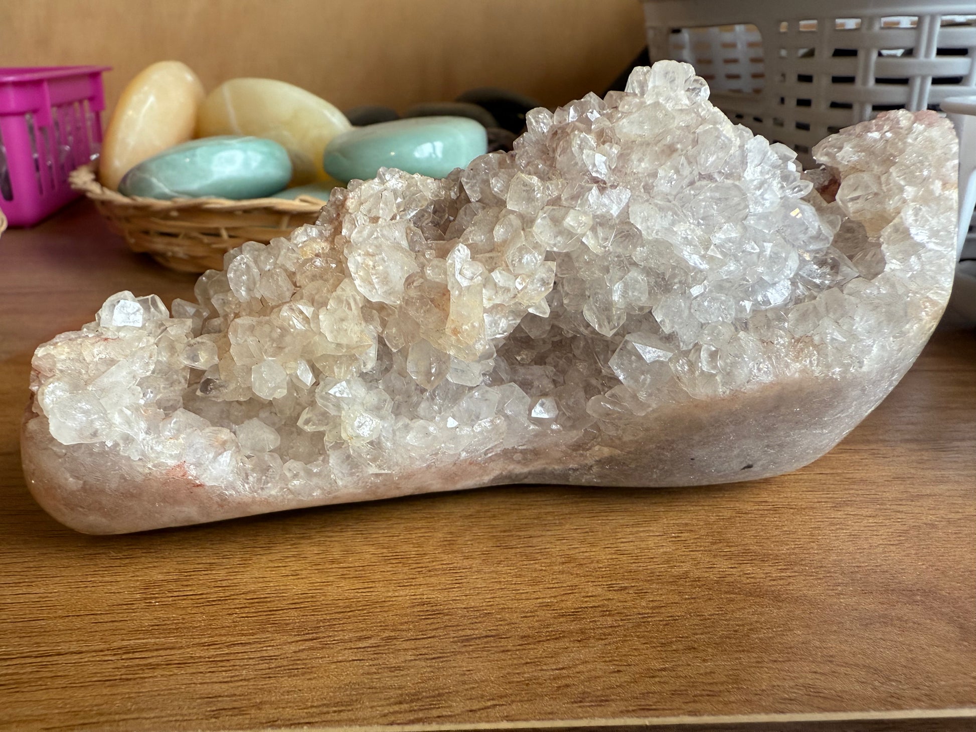 Pink amethyst offers metaphysical benefits such as promoting love, emotional healing, self-esteem, and spiritual connection by balancing the heart, third eye and crown chakras. It's said to alleviate stress, anxiety, and negative emotions, foster clarity and intuition, and create harmonious energy in living and work spaces. The crystal also supports transitions, assists with grief, and promotes restful sleep, according to some beliefs.